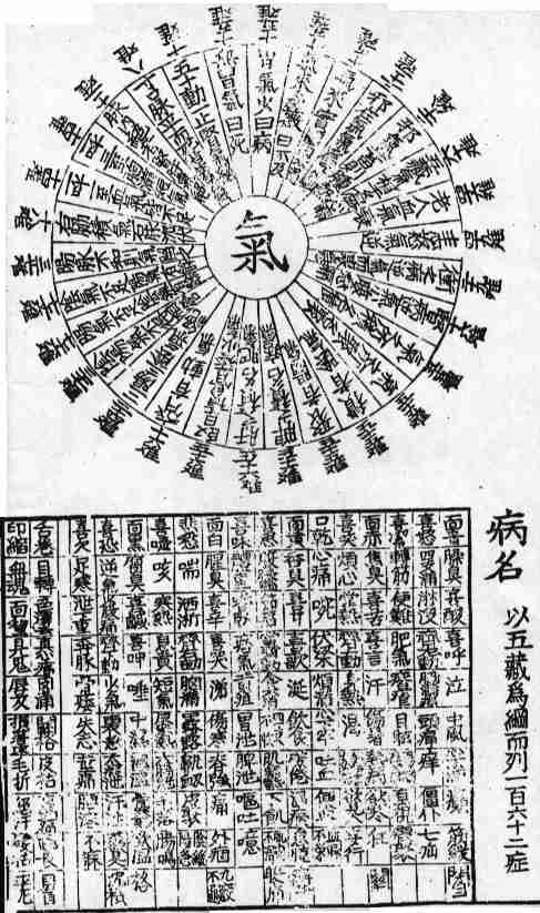 下の図では、右から、肝心脾肺腎の五臓それぞれについて三行づつ病名を列記し、左端の二行には末期の症状について述べています。